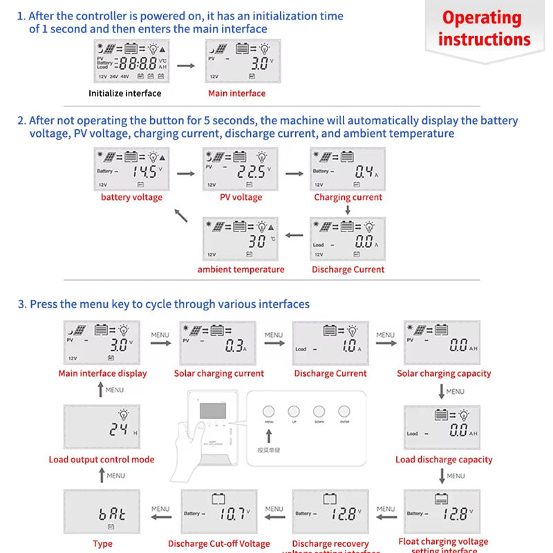 - LCD Display with Parameter Settings: The controller features a simple LCD display for easy monitoring of charging data and allows parameter adjustments. The display will also show fault alarms if issues arise, making it easy to troubleshoot.