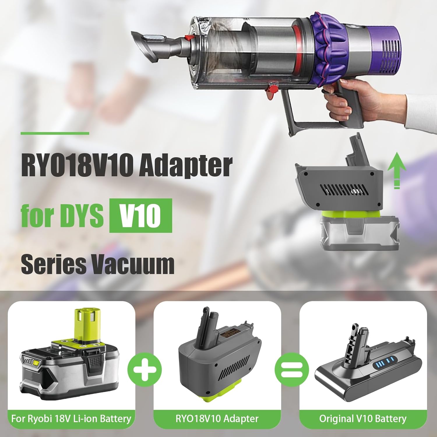 -Excellent Conversion: Adapter for RYOBI 18V One+ series batteries and power supply for Dyson V10 vacuum cleaners. The adapter matches the RYO 18V One+ battery, which is the perfect replacement for Dyson V10 battery. Only the adapter, no battery.