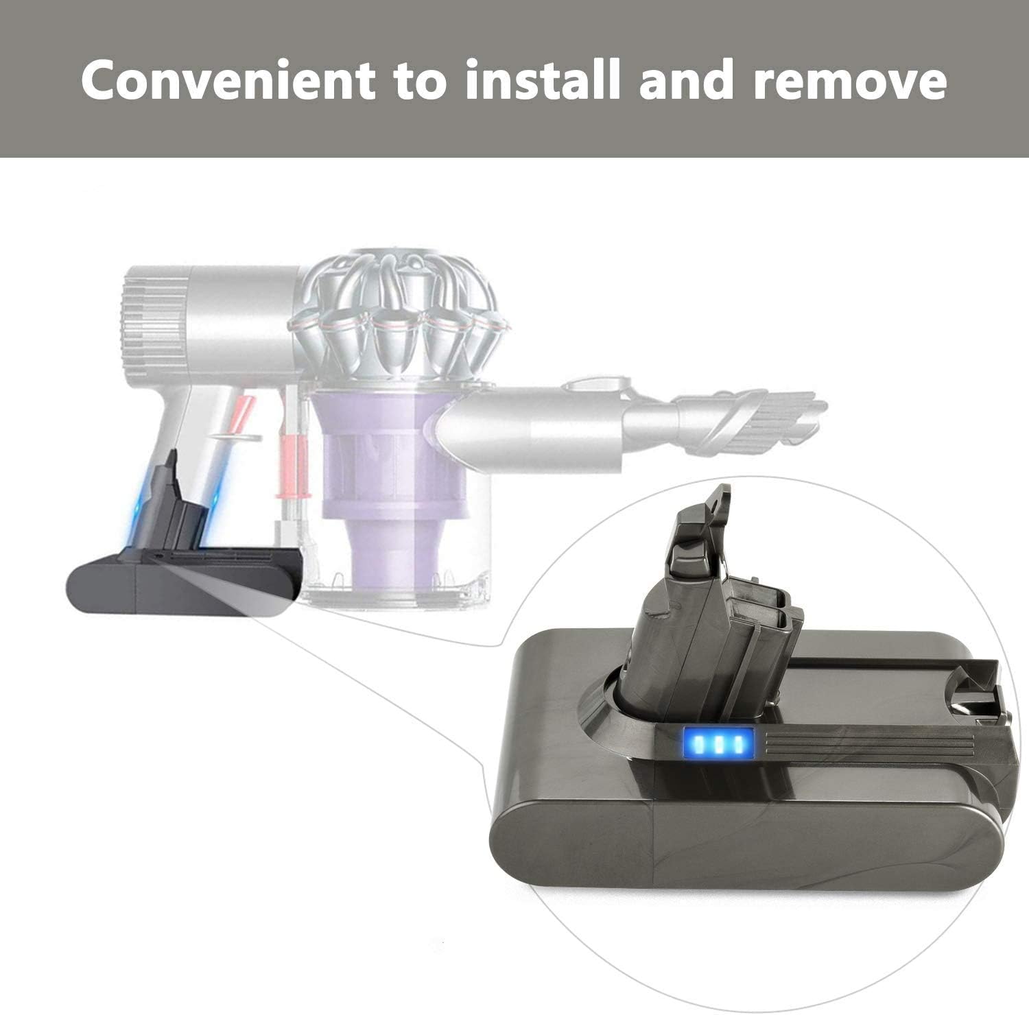 -3 LED NEW DESIGN:With 3 LED blue light indicator, you can easily read the charging level via a smart LED indicator in real-time.Easy to install and it fit with Dyson V6 original perfectly.