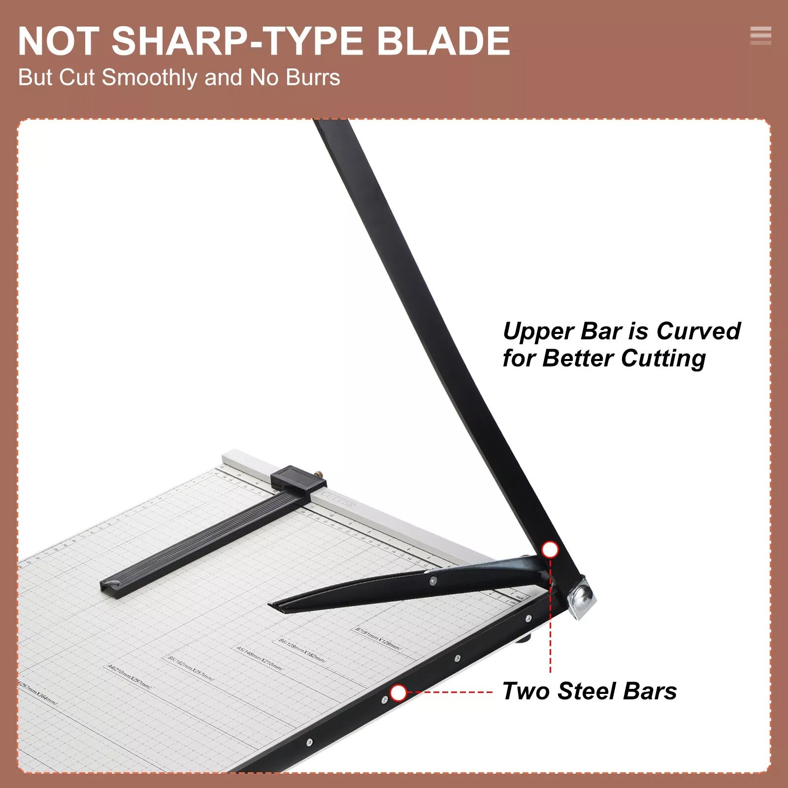 Experience enhanced safety and precision with our A3 Paper Cutter Trimmer, a superior alternative to traditional sharp-type blades. This innovative paper cutter features dual steel bars, with the upper bar curved to provide optimal pressure for improved cutting performance. The metal base and rubber feet ensure a stable cutting platform, while the soft ergonomic handle offers comfort and control.