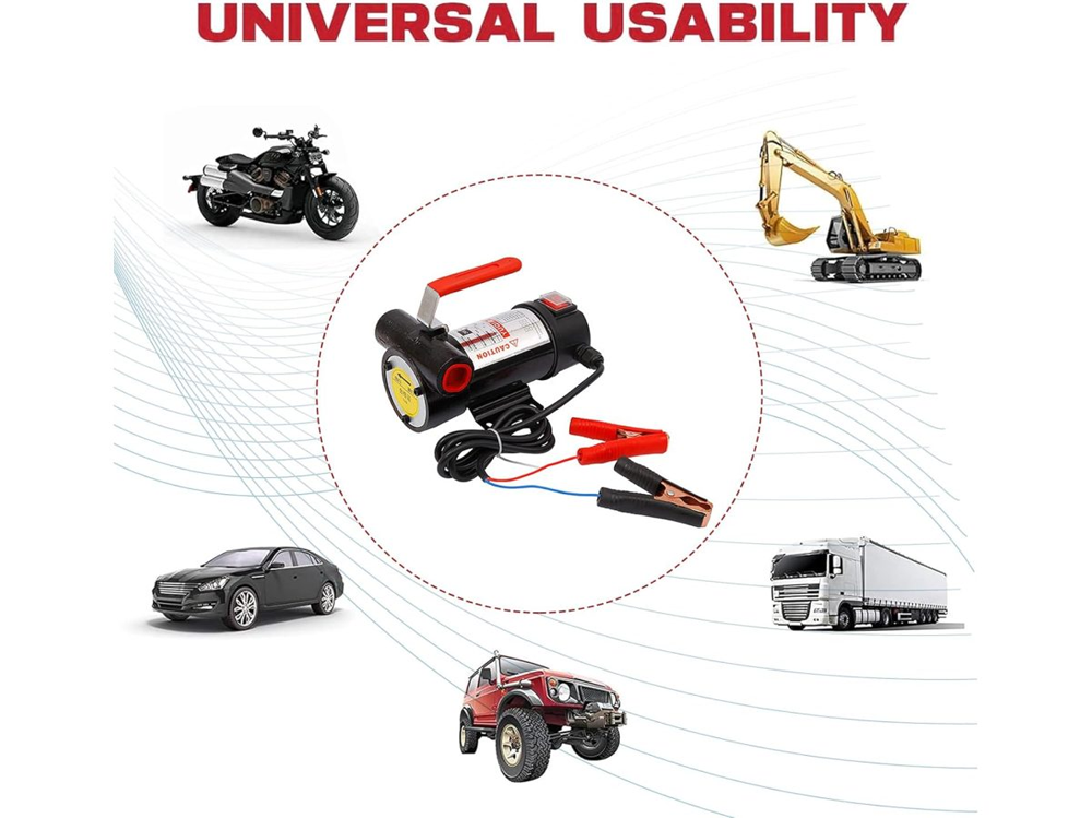 The Fuel Transfer Pump 12V is perfect for transferring diesel, biodiesel, and kerosene in automotive, industrial, and agricultural settings. Fuel Transfer Pump 12V ensures efficient fuel handling while remaining compact and easy to operate. Fuel Transfer Pump 12V is not suitable for low-flammability fuels such as gasoline, liquefied petroleum gas, or alcohol.