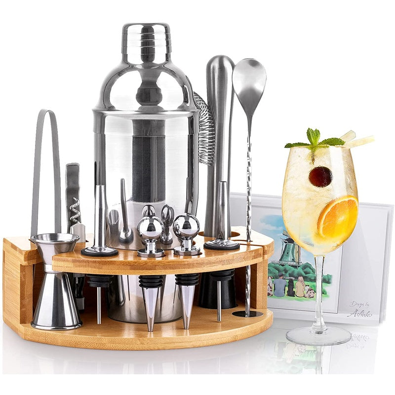 Bartender Kit with Stylish Bamboo Stand, Cocktail Shaker Set for Mixed Drink, Professional Stainless Steel Bar Tool Set - Cocktail Recipes Booklet(750m)