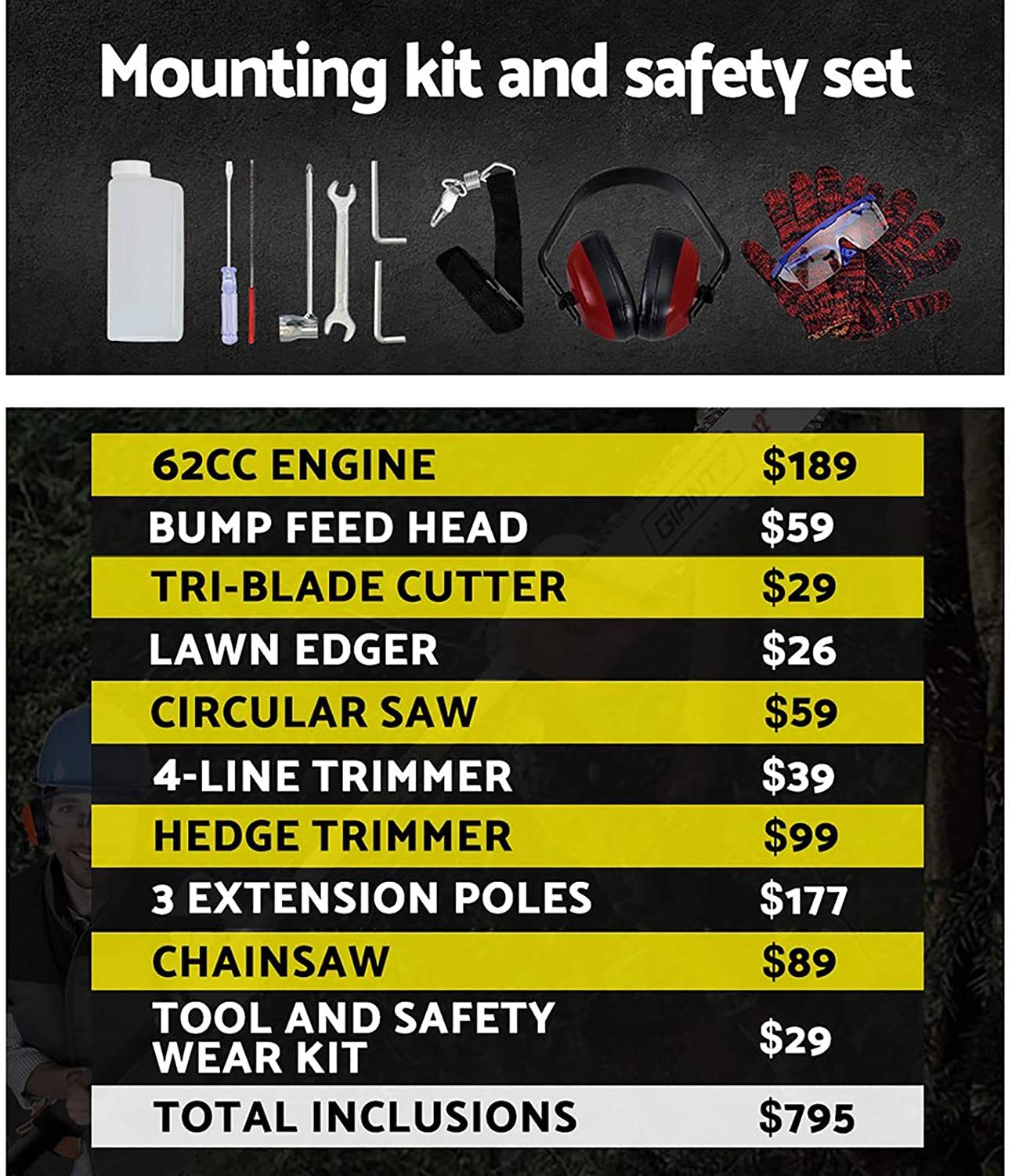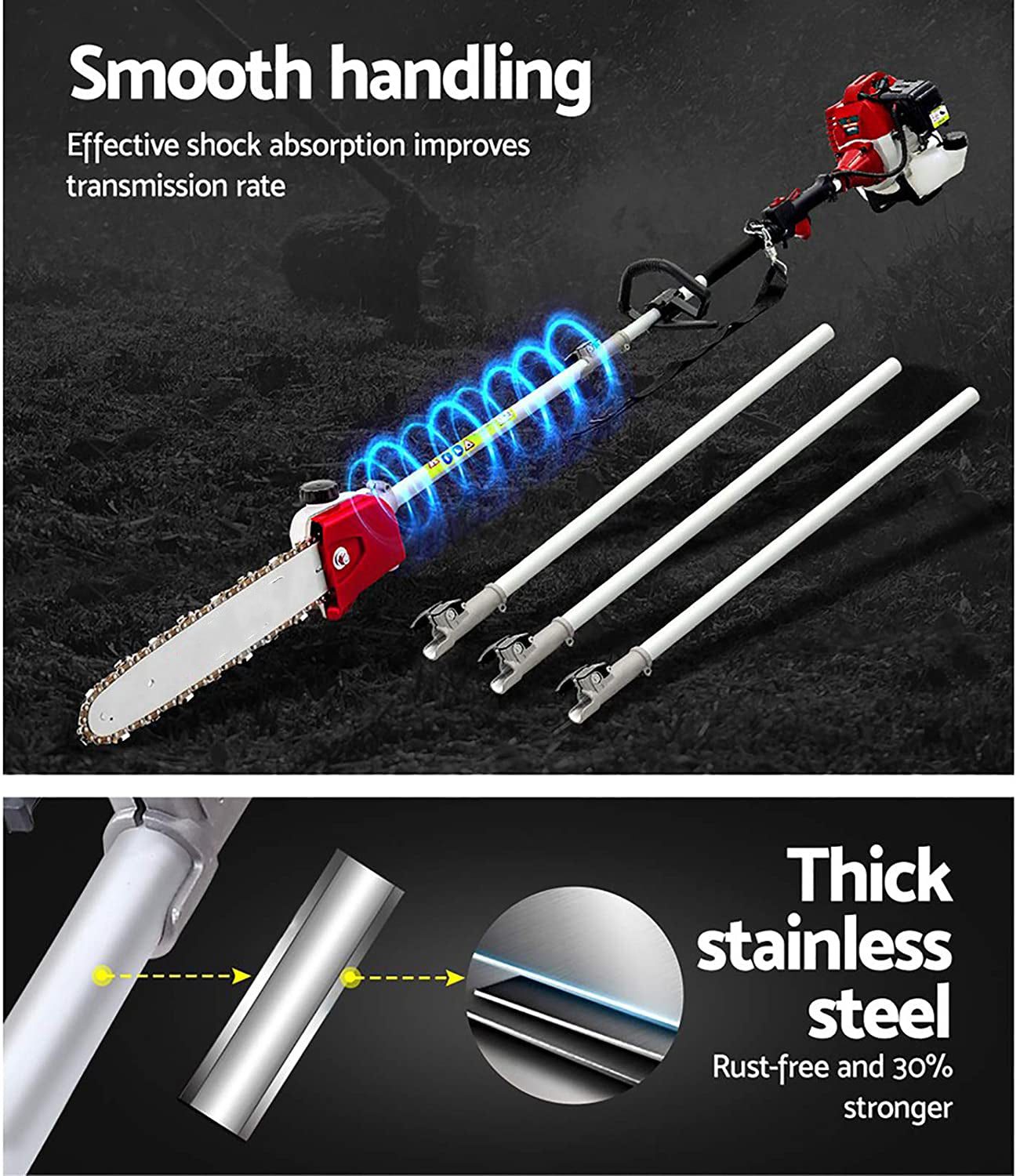 62CC 10-in-1 Multi-Function Garden Tool – Brush Weed Cutter Saw Hedge Trimmer Kit with Pole Chainsaw & Trimmer Attachments