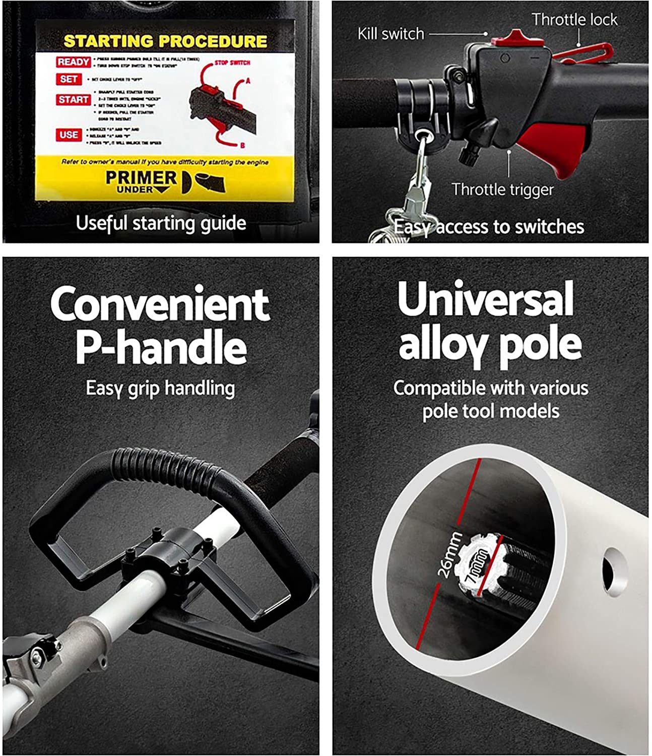 The Brush Weed Cutter Saw Hedge Trimmer is a professional-grade 10-in-1 outdoor power system built for serious property maintenance. Designed around a powerful 62CC EURO 2 two-stroke engine, the Brush Weed Cutter Saw Hedge Trimmer helps you trim hedges, cut branches, clear scrub, edge paths, and tackle thick grass with one reliable power head. With quick-connect couplers, reinforced alloy shafts, and multiple cutting heads, the Brush Weed Cutter Saw Hedge Trimmer delivers the reach, control, and durability needed for seasonal yard work, lifestyle blocks, and contractor jobs. Use the extended pole sections to work safely from the ground, then switch attachments to move from pruning to line trimming and edging without hauling multiple machines.