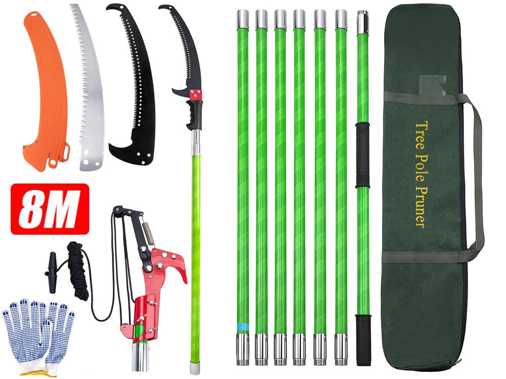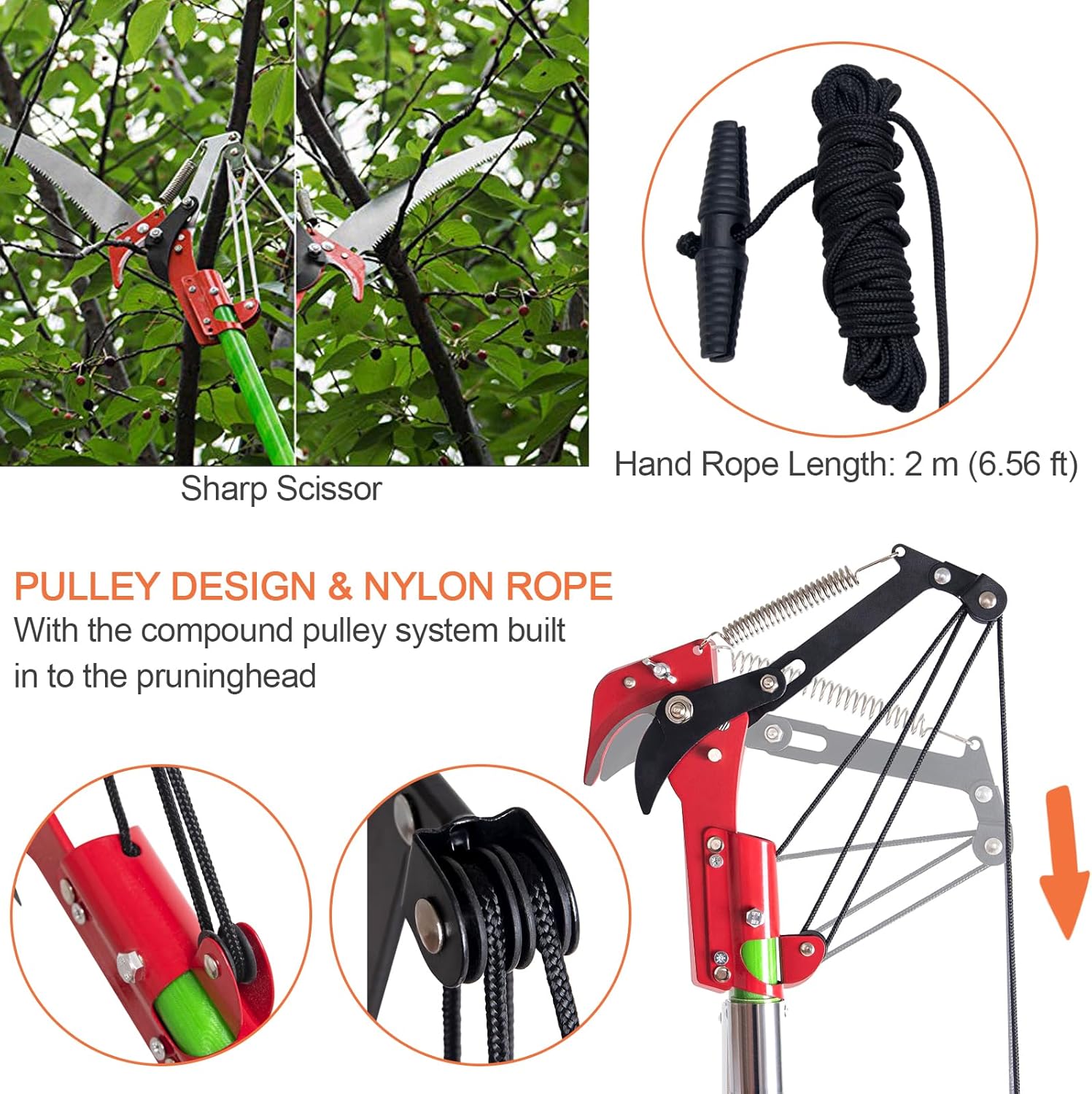 -Pulley Spring System Pruning Scissor: This pole pruner set includes a sharp saw head with scissors. It is controlled by a drawstring pulley system and uses to trim smaller branches. The high elasticity rope (total length 6.56ft) is hard wearing. You can trim the branches by pulling the rope, which is labor-saving and no need to climb up.