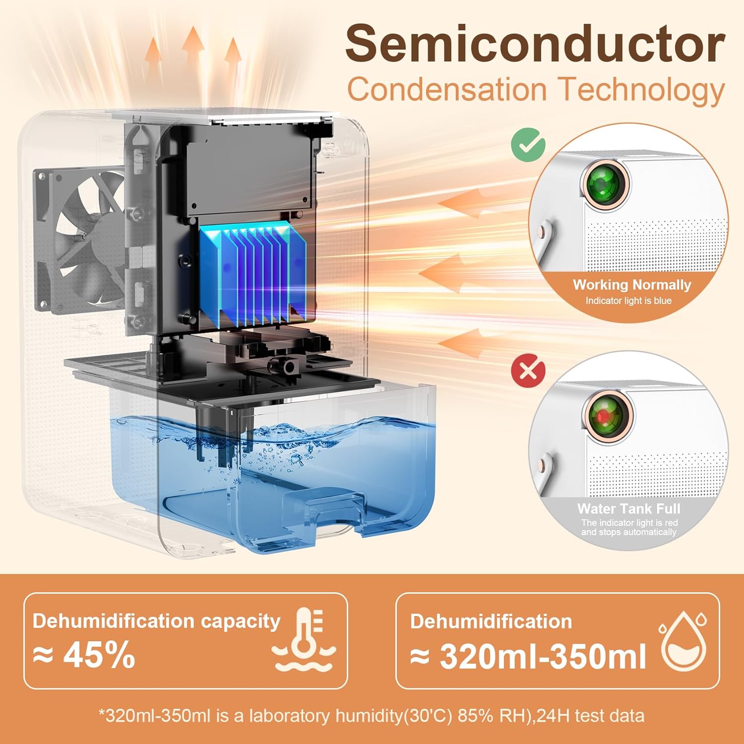 This high-performance dehumidifier uses advanced semiconductor condensation technology to effectively extract excess moisture from the air, keeping humidity levels below 45%. The dehumidifier creates a healthier and more comfortable living space, perfect for use in bedrooms, bathrooms, basements, and other humid areas.