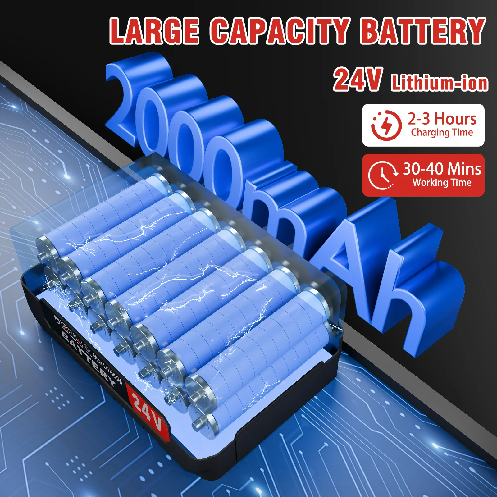 - Battery: 24v lithium battery (set includes 3 batteries)