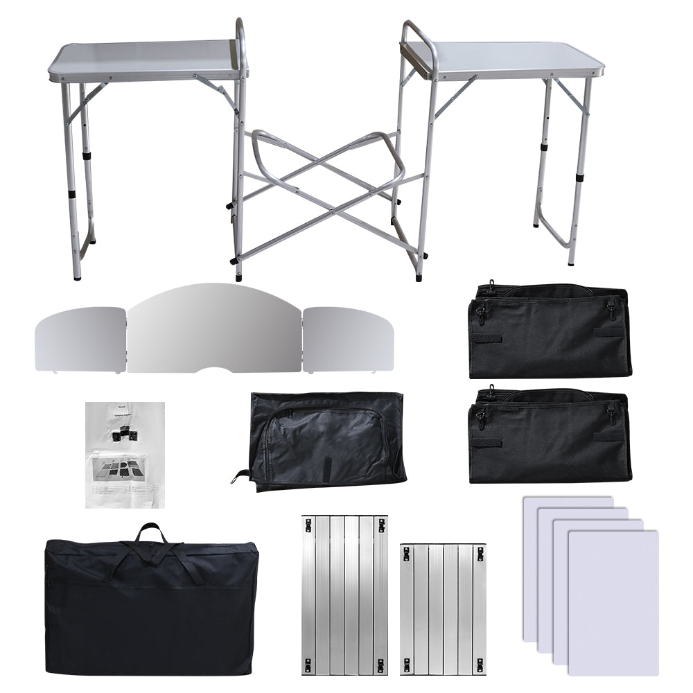 With plenty of room for all your cooking gear, our portable camp kitchen camping kitchen really gets the job done when you need to prep food on the go. The spacious design has plenty of room for food prep and storage including 4 aluminum tabletops and 3 cupboards. A handy windscreen is there to block the wind for heat retention and faster cooking. camping kitchen helps keeps you organized, so that you spend less time looking for utensils and more time seeking adventure.