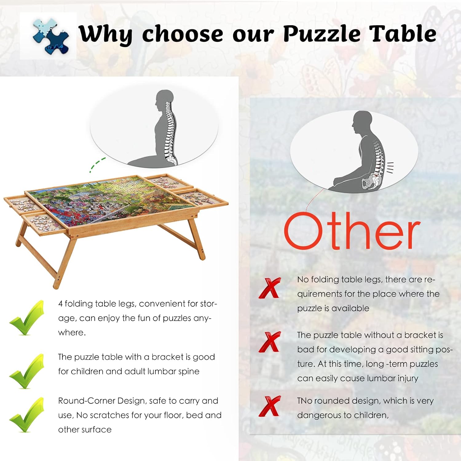 Multipurpose Use: The puzzle board with folding legs is versatile, allowing you to use it in various settings such as the living room, study, or bedroom. It is perfect for organizing puzzles, working, or engaging in small handicrafts. Made of pure wood, this table combines aesthetics with practicality, offering a high-end appearance and pre-fixed stability.